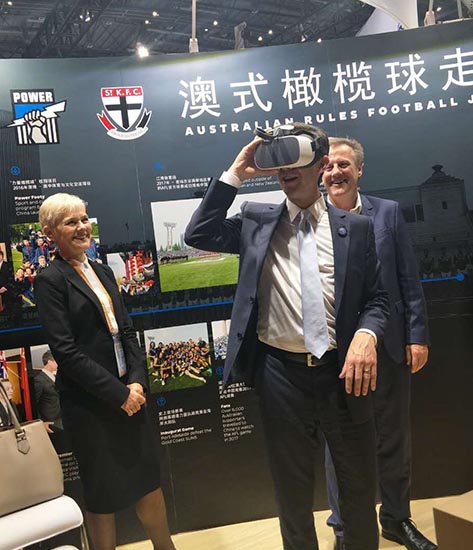 澳大利亞貿(mào)易、旅游和投資部部長西蒙伯明翰先生參觀了澳大利亞企業(yè)館并體驗(yàn)了我們精心設(shè)計(jì)的VR橄欖球區(qū)域,給予了我們高度贊揚(yáng)和認(rèn)可