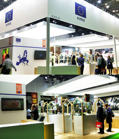 歐盟展團(tuán)簡潔國際化的設(shè)計(jì)風(fēng)格,配合獨(dú)特創(chuàng)意的歐洲街市場景產(chǎn)品展示方式,吸引了眾多的觀眾參觀品嘗歐盟展區(qū).