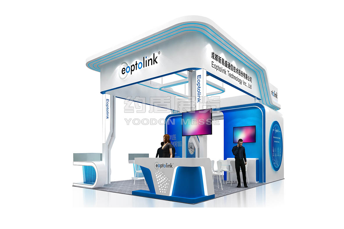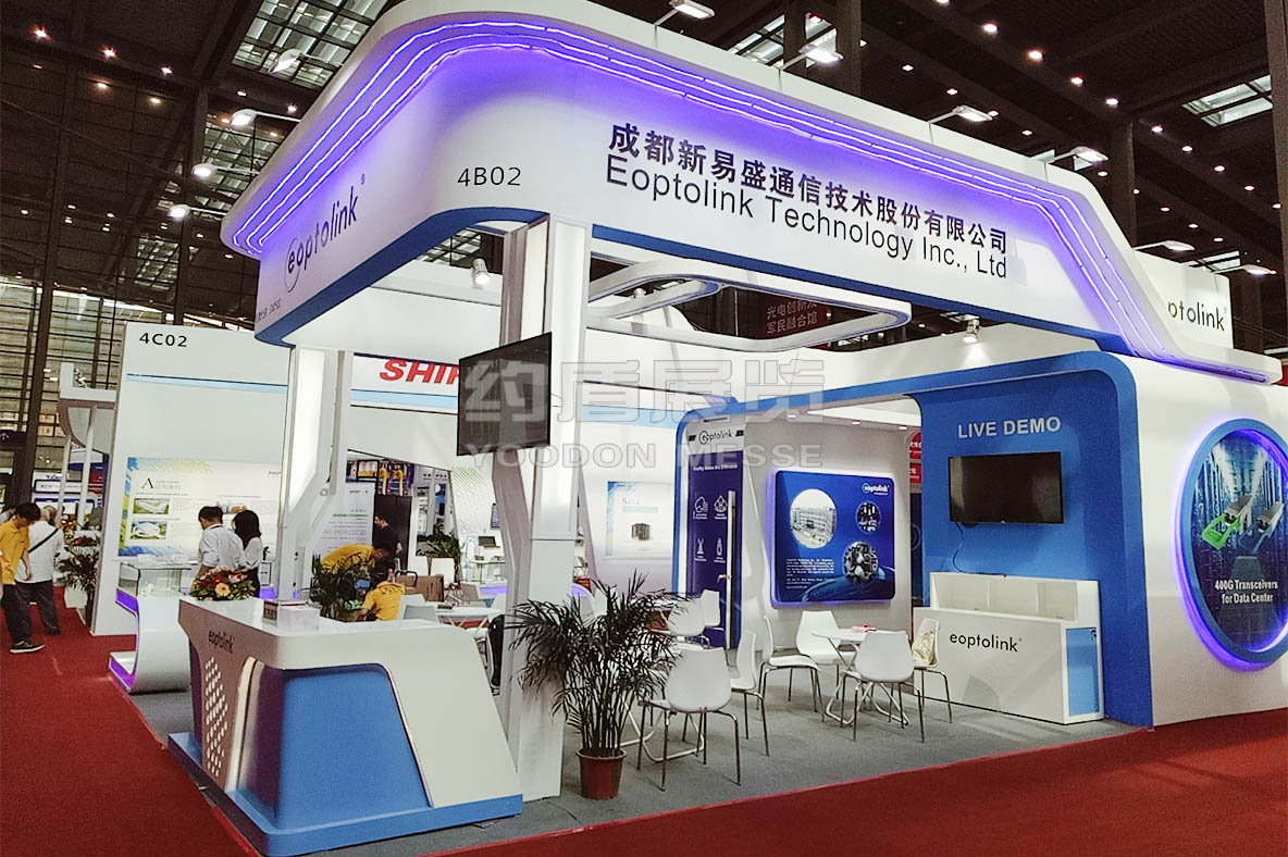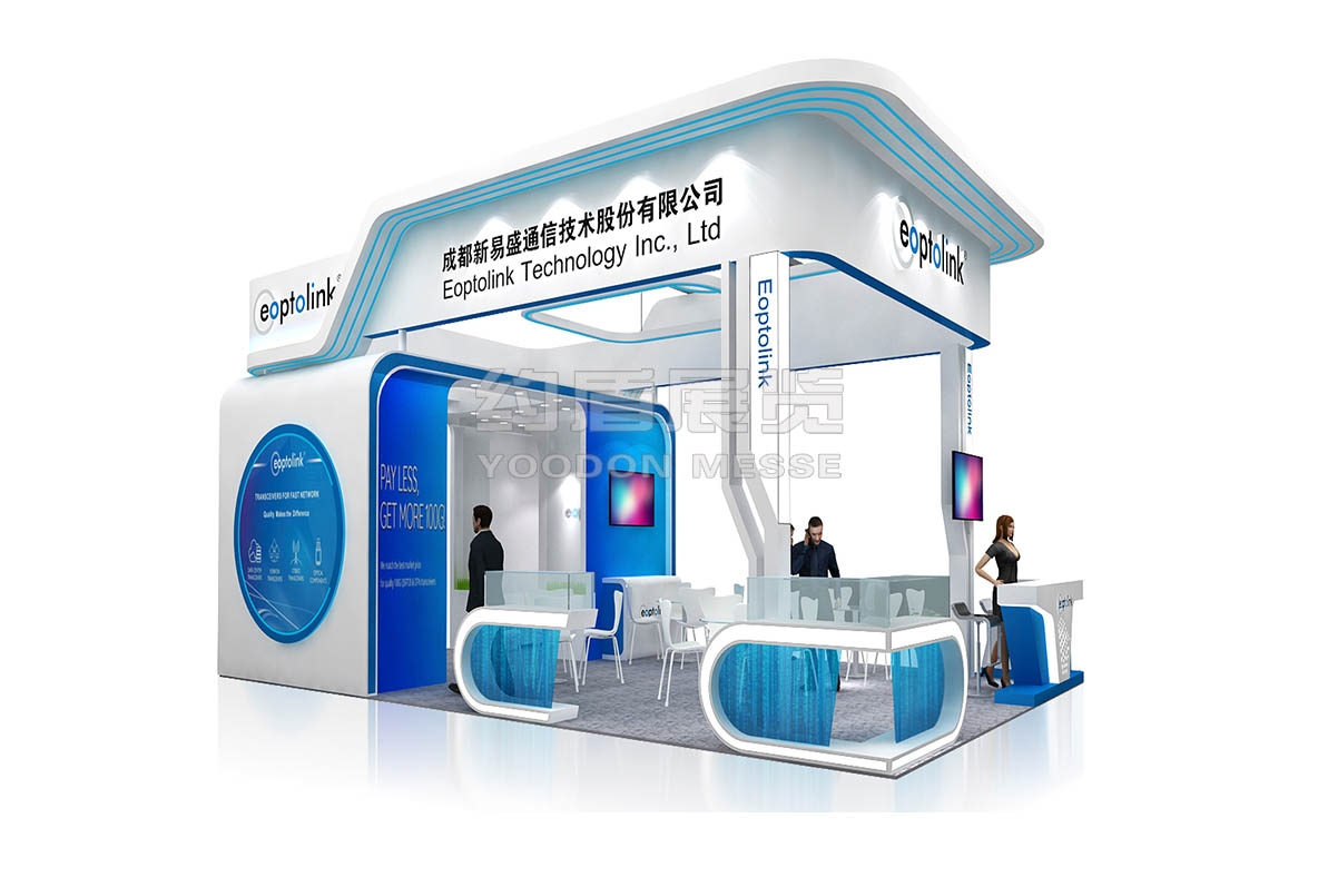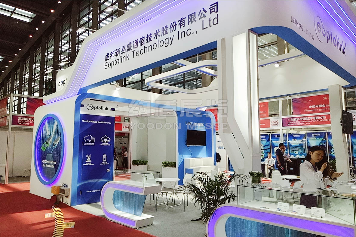 新易盛展臺設(shè)計搭建的風(fēng)格主題是藍(lán)色,通信電子展臺設(shè)計搭建的主題色,新易盛展臺主要推出了公司最新技術(shù),向全世界展示。
