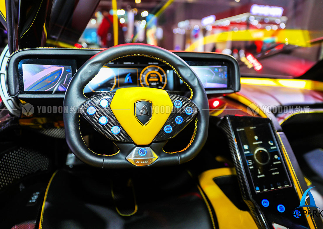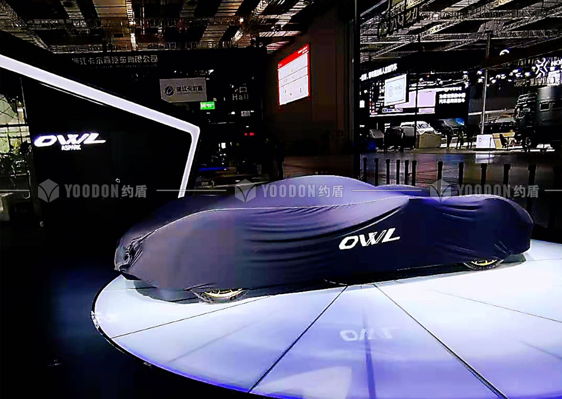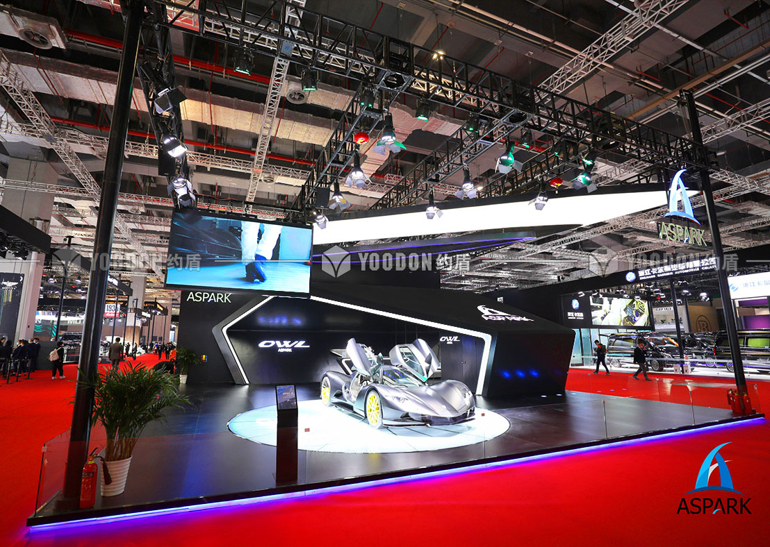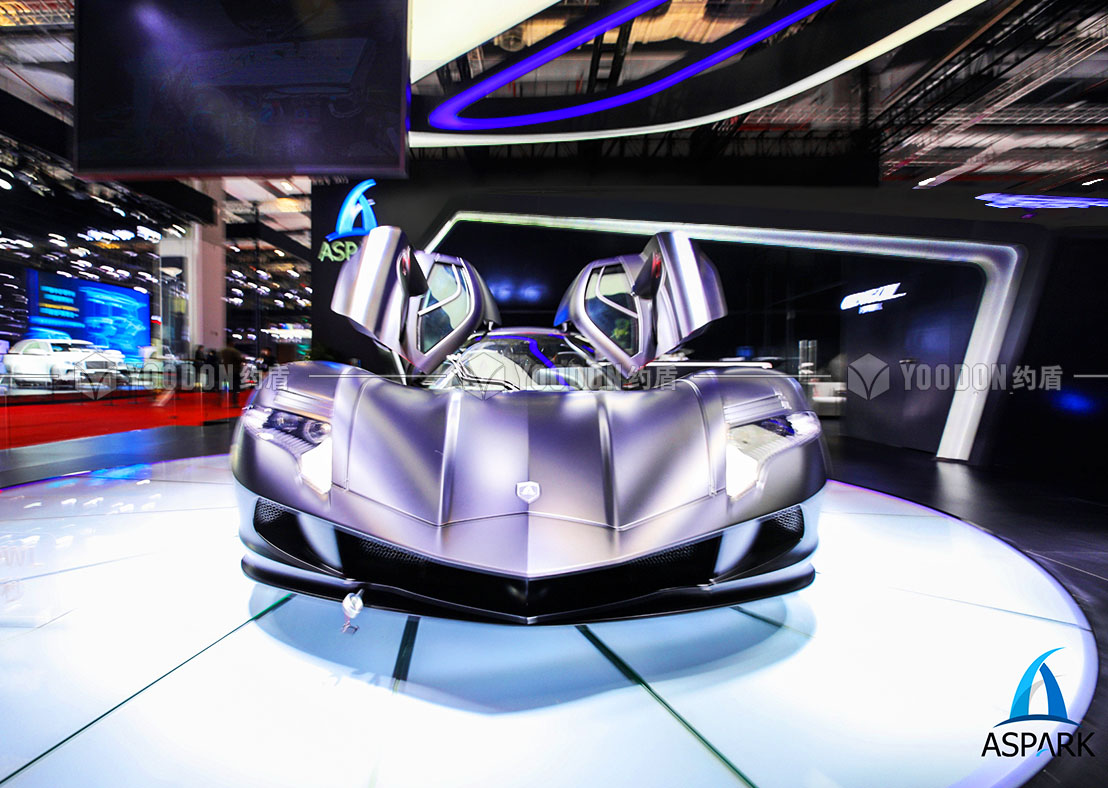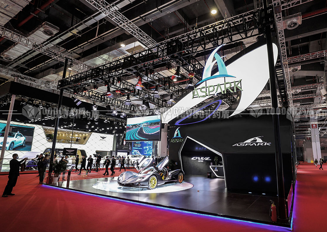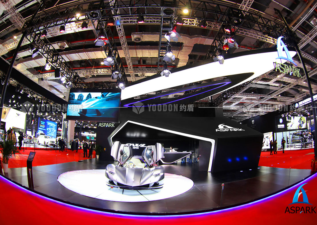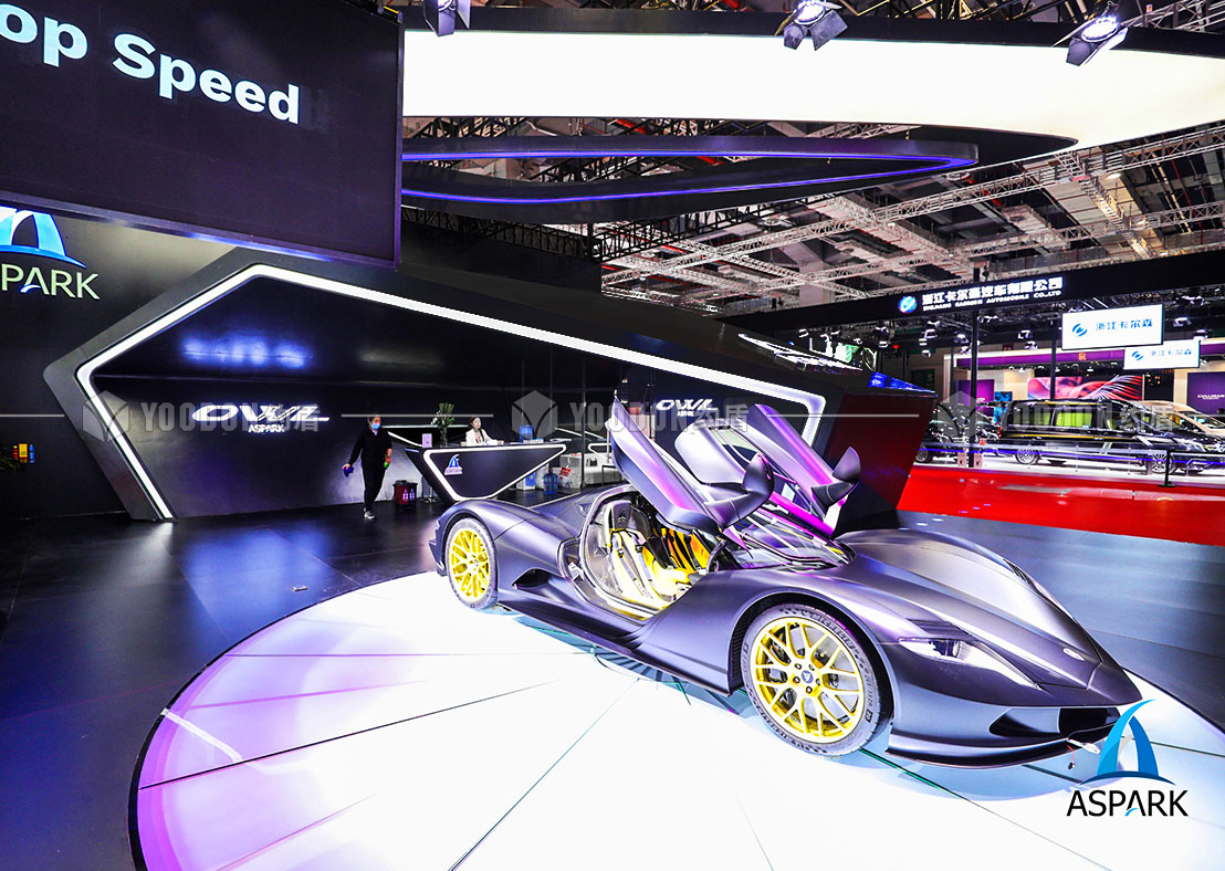 展臺設(shè)計思路皆尊崇速度感與獨特感,整體造型設(shè)計跳出常規(guī)邏輯,使人耳目一新,傾斜的異形吊頂仿佛是受到跑車高速行進的風速影響,在靜止的空間內(nèi)帶來極致的動態(tài)感受,與展品的特性、造型等達到各方面的契合。