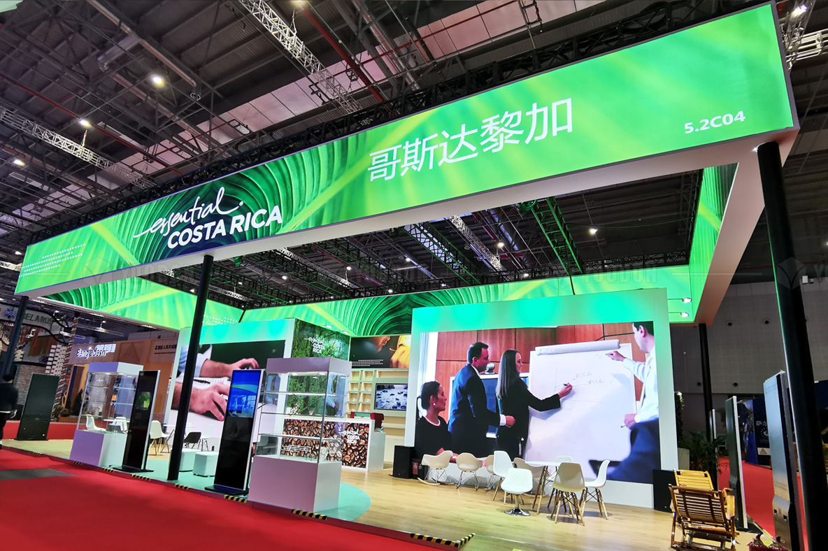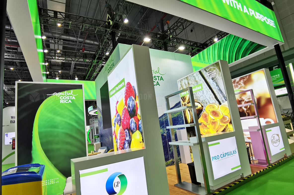 WES模塊化在本次哥斯達(dá)黎加中國國際進(jìn)口博覽會上國家展和企業(yè)展的上海展臺設(shè)計搭建案中的設(shè)計突破點(diǎn)為以下: